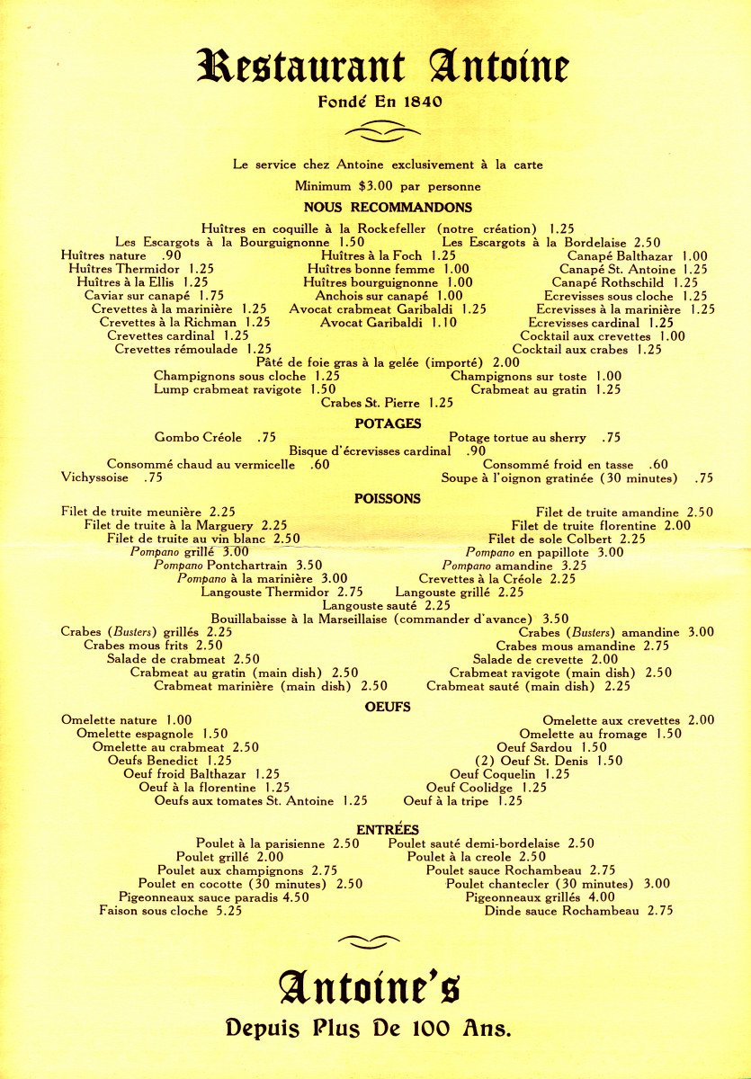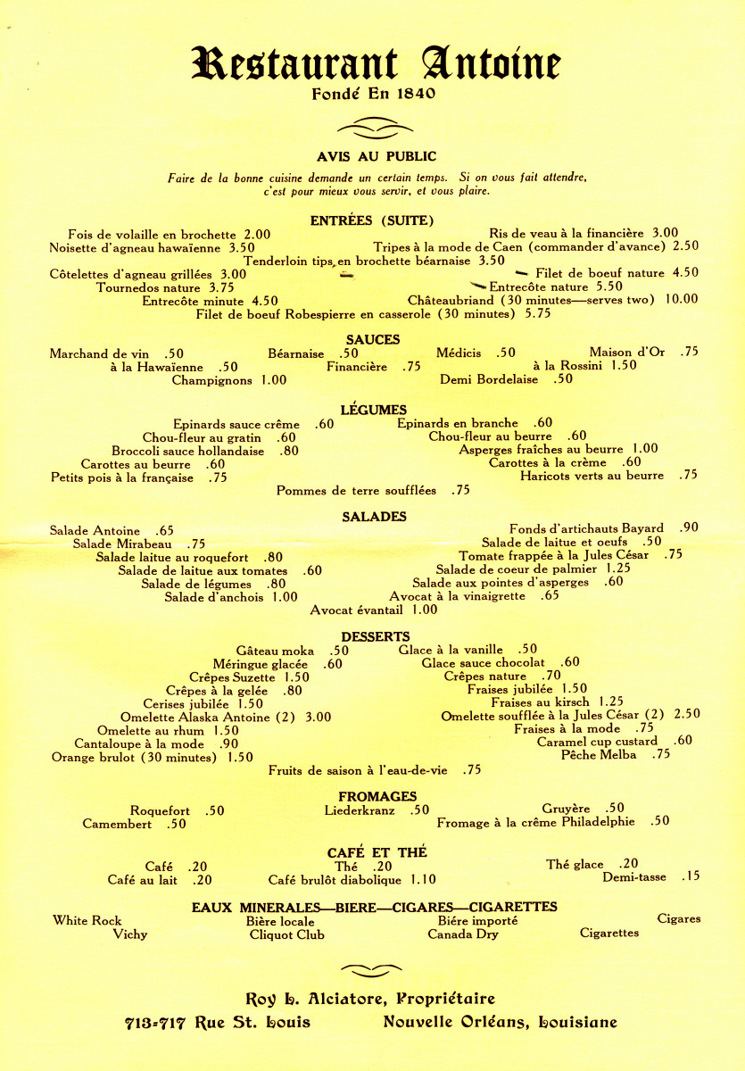 Following is the menu for what was considered at the time to be an expensive restaurant. Today the price per person according to Google Maps is $50 to $100. I know they are doing something right, though, having been in business since 1840 (at which time there were probably many customers whose native language was French).