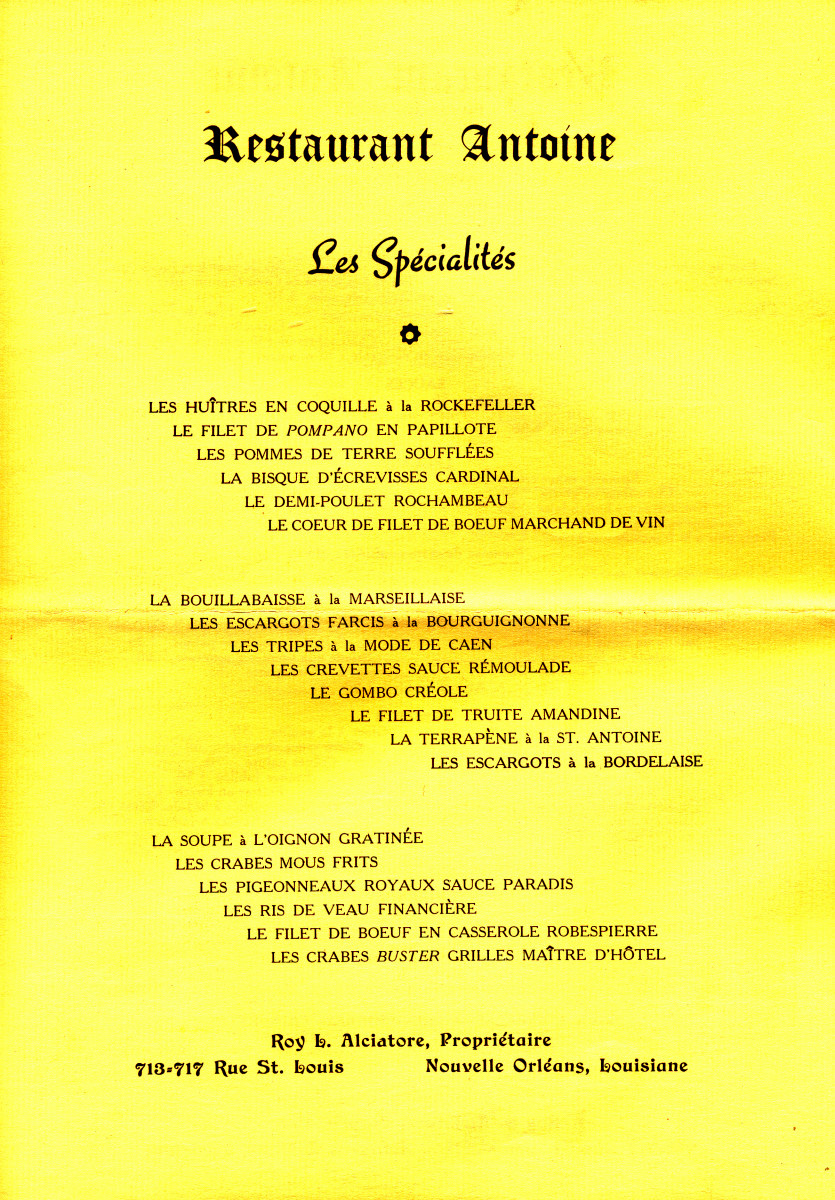 It is interesting that there are a lot of Anglicisms in the menu–the same thing I see in quite a few Mexican restaurants. One example at Antoine’s is “crabmeat.”